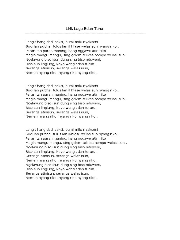 A suci lan putihe tulus lan ikhlase. Terjemahan lagu edan turun dalam bahasa indonesia. Bm langit hang dadi saksi. Langit hang dadi saksi, bumi milu nyakseni. Serange atinisun, serange welas isun,.